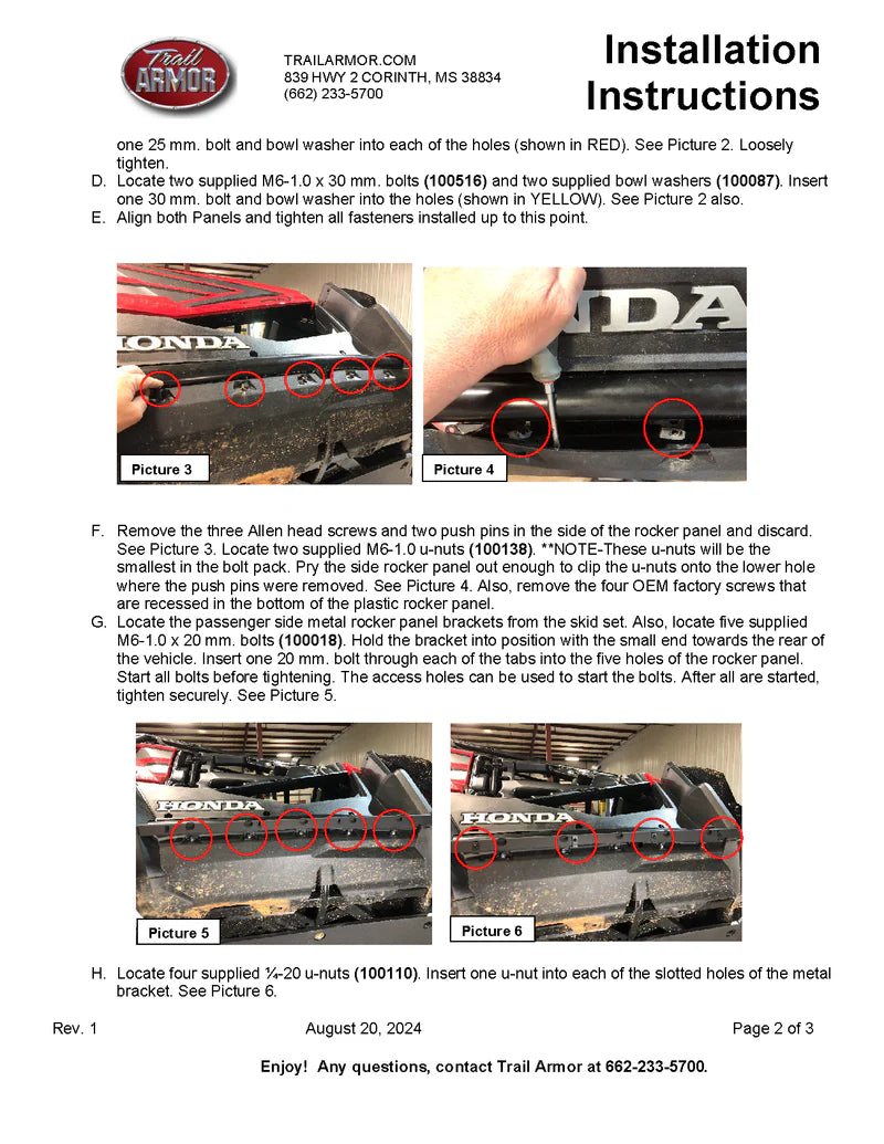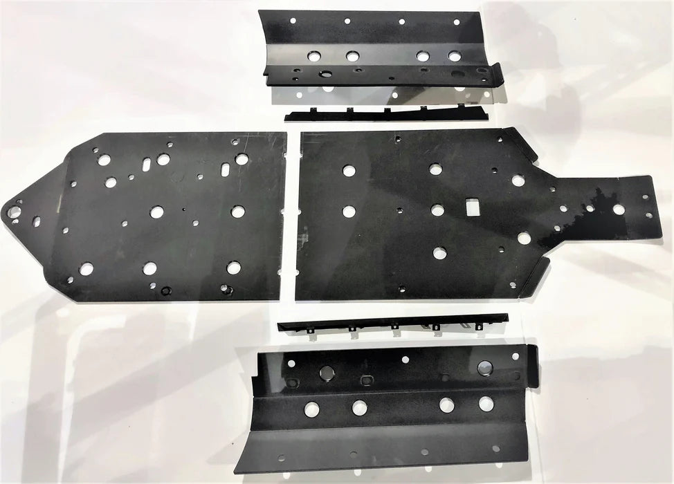Trail Armor offers comprehensive under-vehicle protection with its full skid plate set designed for 2019-2022 and 2024 Honda Talon 1000 R, Talon 1000 X, 2021-2024 Talon 1000 R Fox Live Valve, Talon X Fox Live Valve, 2023 Talon 1000 XS, Talon 1000 RS, Talon 100 XS Fox Live Valve, and Talon 1000 RS Fox Live Valve models. Crafted from 1/2" Super Tough polymer, these skids are lighter than traditional metal options and resist dents, corrosion, and galling by absorbing impacts without retaining “memory.” The innovative formed front leading edges shield critical frame and wheel well areas while facilitating smooth obstacle clearance. Extended side plates provide extra coverage, unlike many competitors that leave side panels exposed. Installation is straightforward with panels that cover front and rear differentials, feature maintenance access holes, and include corrosion-resistant hardware. Drain holes allow debris to wash out easily without removal, and recessed mounting protects fasteners. Note: A-arm guards shown in images are sold separately. Refer to the fitment chart for specific model compatibility. Colors are a special order and are non-returnable.
